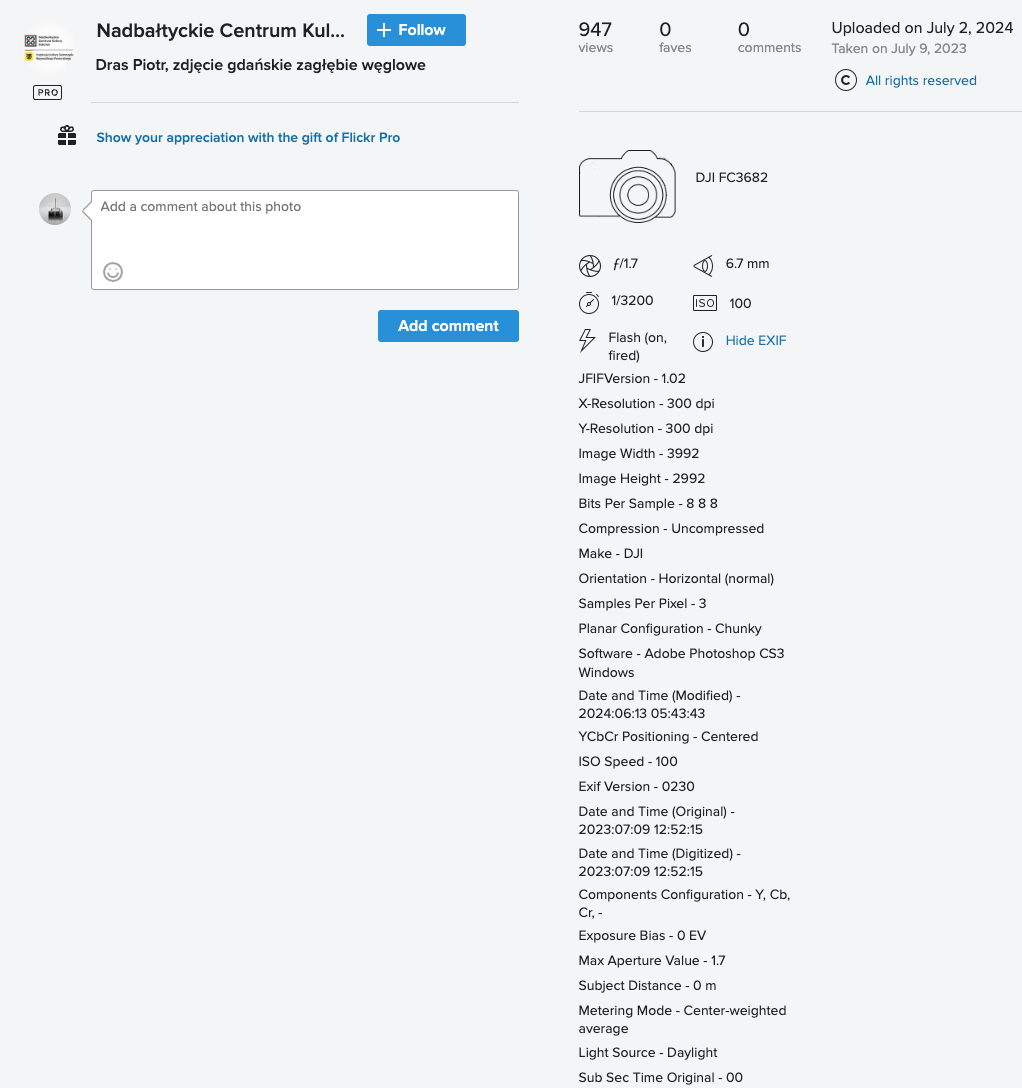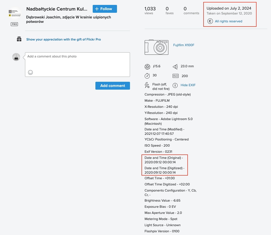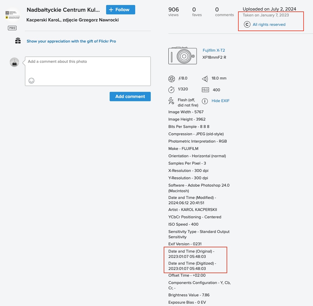 Jedno trzeba przyznać organizatorom, że oddanie serwisowi flickr prezentacji prac, pozwala w łatwy sposób zweryfikować, że to zdjęcie nie spełnia głównego warunku dopuszczenia do konkursu. Zostało ono bowiem wykonane (zgodnie z danymi exif, które flickr pokazuje) 12 sierpnia 2020 roku, czyli ponad trzy lata wcześniej niż zezwala na to regulamin w pkt. 5: “Do konkursu można dostarczać zdjęcia zarówno publikowane, jak i niepublikowane, wykonane w okresie od 16 czerwca 2023 roku do 14 czerwca 2024 roku.”